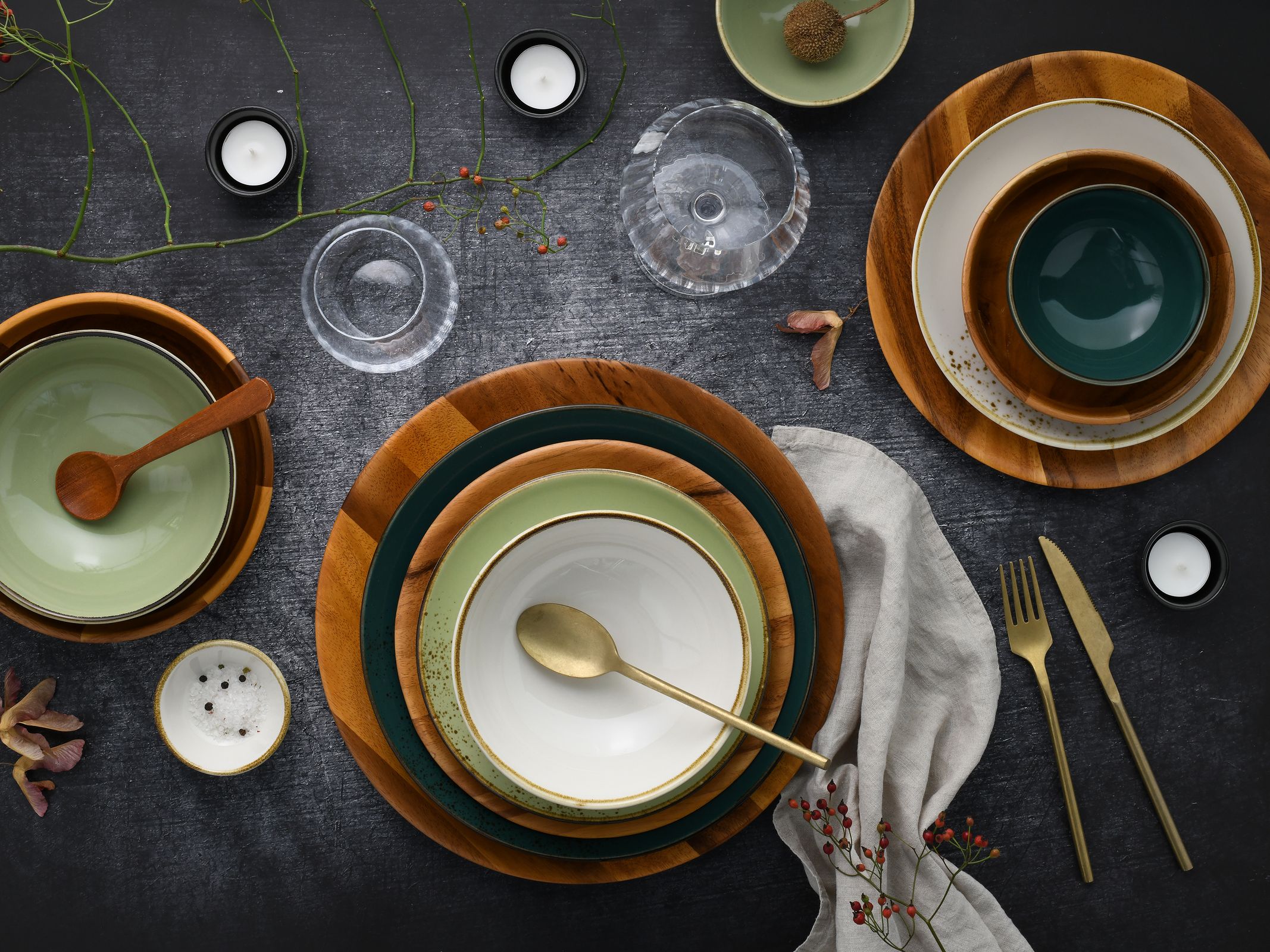 Dekor: Farbglasur mit Reaktivglasur-Effekt und feinen Sprenkeln (Handmade-Look), hochaktuelle Coupeform